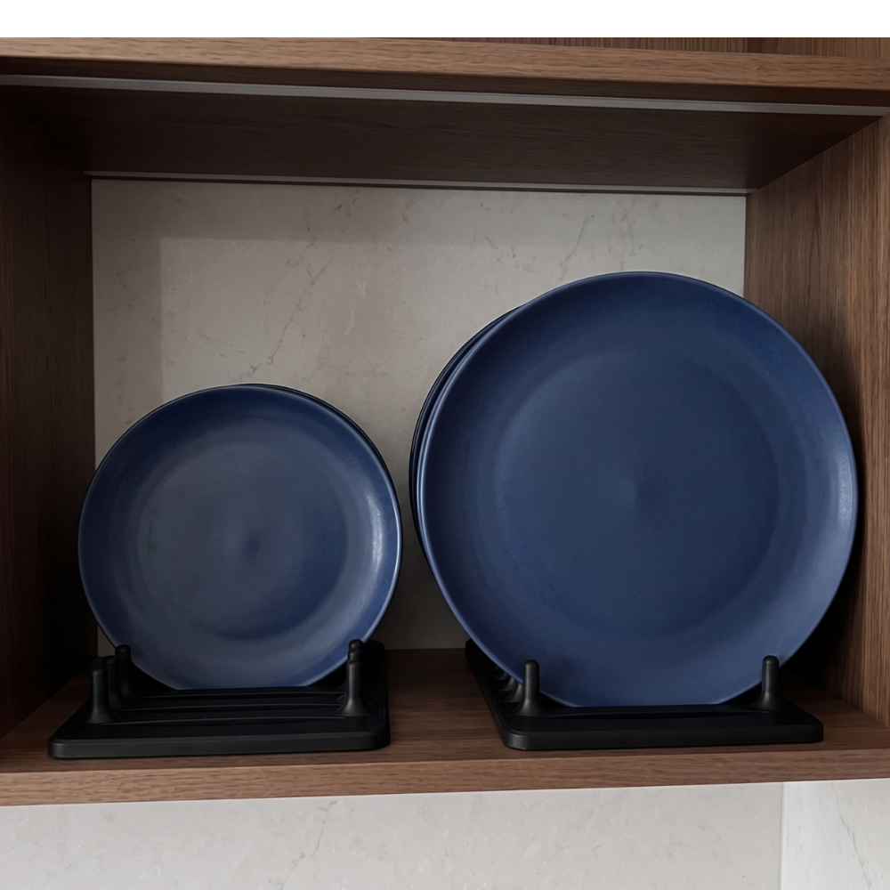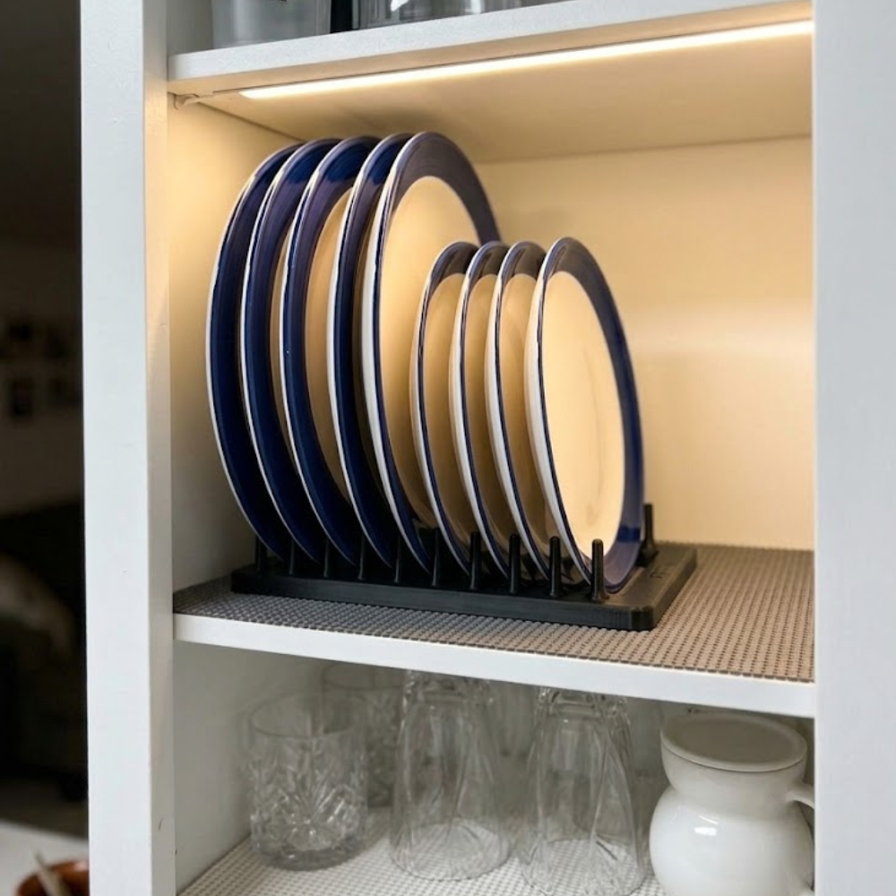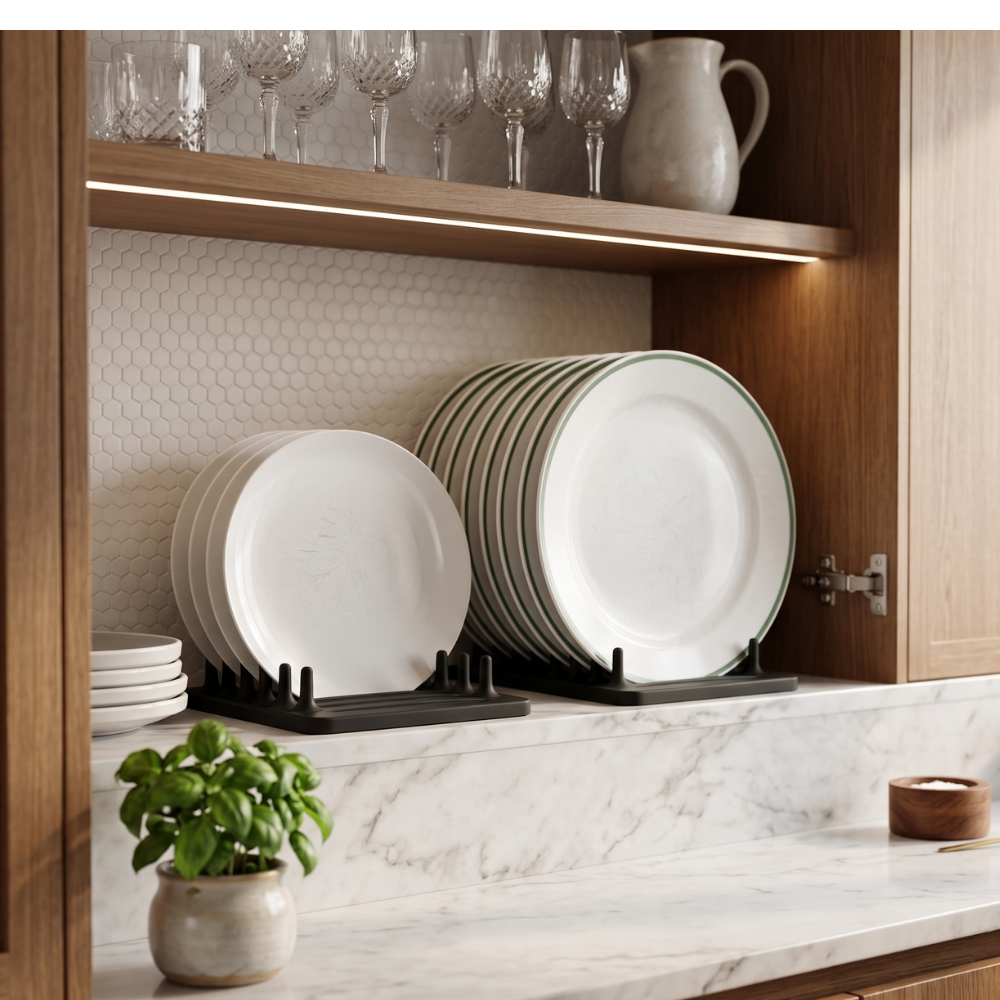 Combien de fois avez-vous empilé vos assiettes en hauteur, au risque de les ébrécher ? Le range assiette vertical Ecomii repense entièrement l’organisation de votre cuisine : vos assiettes se glissent à la verticale, accessibles d’un seul geste, sans jamais avoir à déplacer toute la pile.